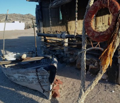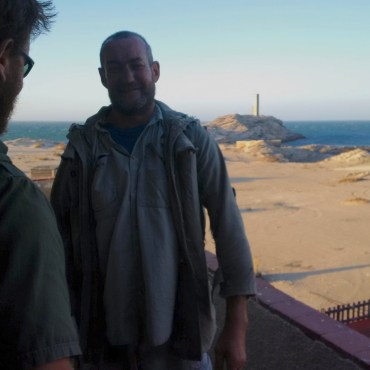 The viced-up strong man eventually managed to march us back to the furnitureless “cafe” after showing us the sand-filled outhouses, the half-buildings by the cliffs, the desolate camp ground, the rusted and weathered tower on the tip of Diaz Point, and the battered and landlocked boat which he intended, in the near future, to turn into some kind of accommodation for dwarfs. For a brief moment, he took in the vast sea view. In somewhat of a contemplative state, his melancholy lasted about three seconds. Touching.